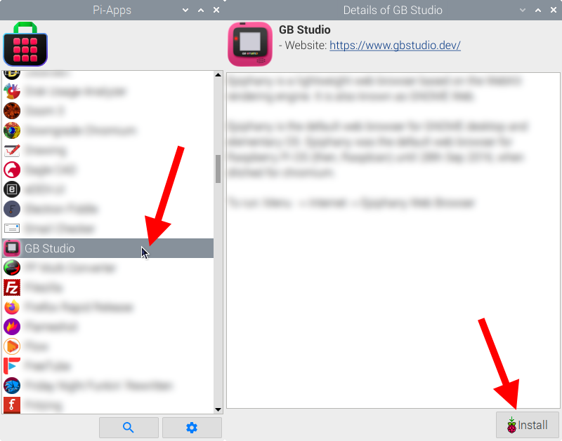 Just click Install and Pi-Apps will install GB Studio for you!
